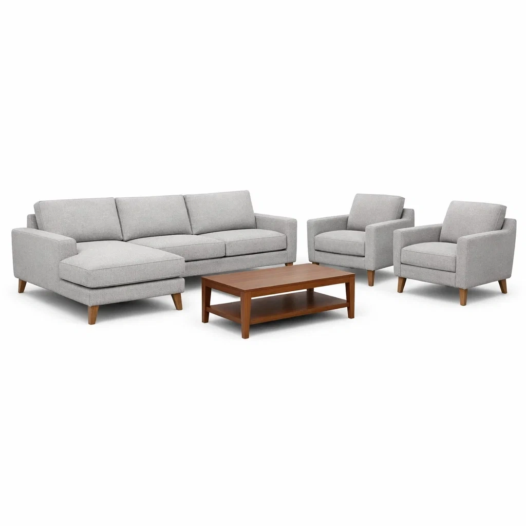 Set di divani in Tessuto Grigio con Chaise Longue, Struttura in Legno e Tavolino