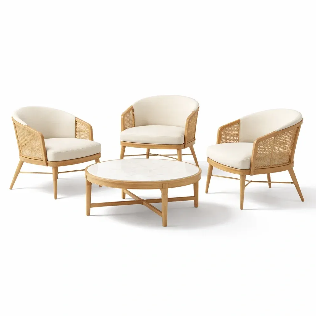 Il set include tre poltrone e un tavolino rotondo. Le poltrone hanno una struttura in legno massello e schienale in rattan, con cuscini rivestiti in tessuto. Il tavolino ha una struttura in legno massello e un piano in marmo.